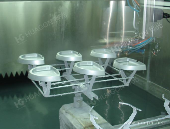 上料-手動靜電除塵-素材預熱-手工放料-自動噴涂-靜置-隧道式烘烤-冷卻-下料